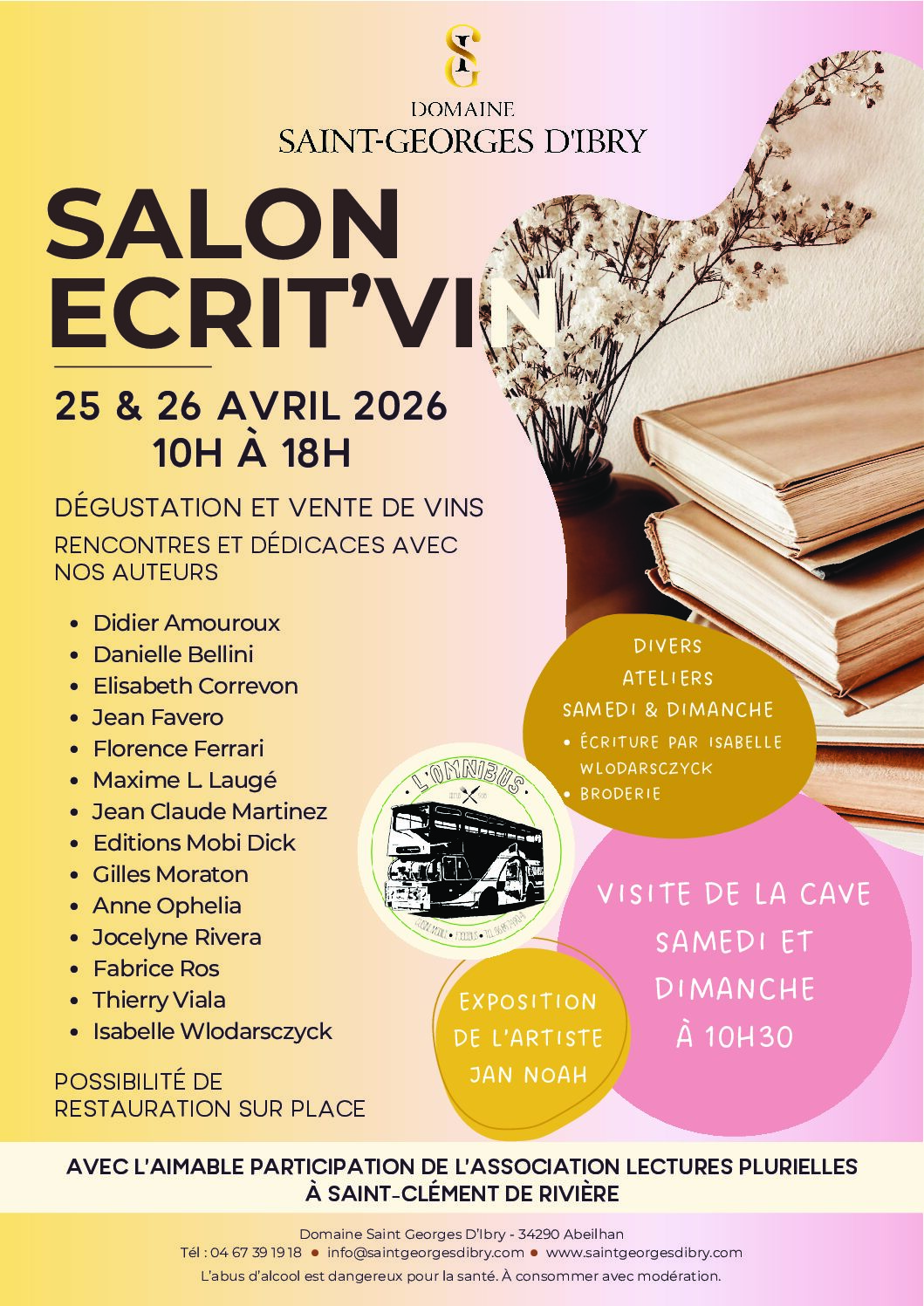 Et voici le printemps qui nous apporte un air de lecture, et qui nous permettra de lire à l’ombre d’un arbre dans son jardin ou dans un parc… Vous savez, pour ceux qui me suivent, que je préfère largement les petits villages avec leurs bénévoles très investis que les grandes manifestations où les auteurs s’entassent et alpaguent le lecteur comme un vulgaire client en jetant un œil jaloux sur le stand du voisin ! Ainsi c’est le premier salon dans ce village situé tout près de Lodève. Profitez d’une belle journée pour visiter son musée, savons et tapisseries, et soyez curieux comme je le suis de découvrir ce village. Et voici une autre affiche pour avril:Nous voilà repartis pour une belle année. Et comme toujours j’ai hâte de vous rencontrer !